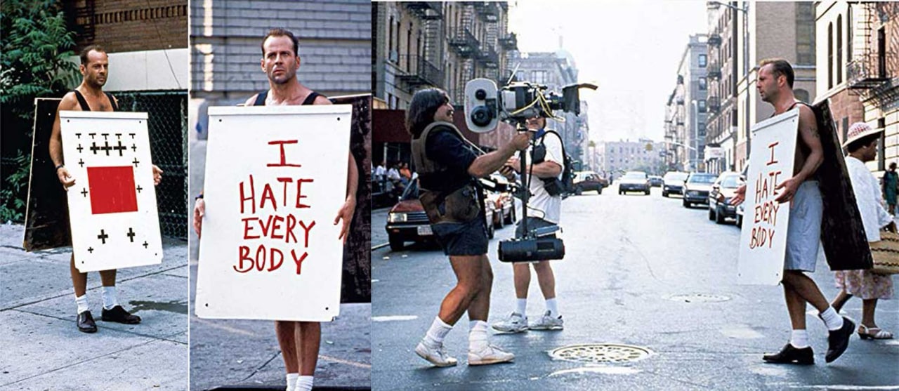 Для одной культовой сцены в «Крепком орешке 3: Возмездие», где Брюс Уиллис разгуливает по Гарлему с крайне провокационными плакатами на груди, были изготовлены целых две версии рекламных щитов.