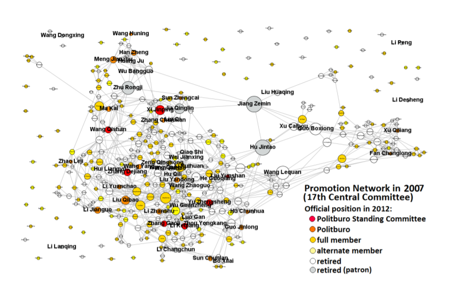 У Франциски Келлер из Гонконга даже более крутой подход — она выстраивает сети патрон-клиенстких отношений между членами китайского ЦК. Делается это следующим образом: чиновник становится патроном, если другой чиновник, работающий под его началом, получил повышение (второй, соответственно, становится «клиентом»). Келлер изучает, с кем работали 1183 будущих члена ЦК, и создает сети вроде той, что можно увидеть на прикрепленной картинке — знаю, что на ней понять ничего невозможно, но она пригодится чуть позже.