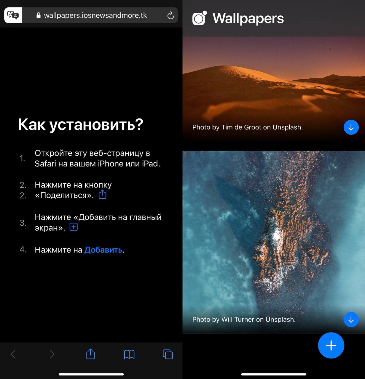 Сегодня нашёл интересный сайт, который при добавлении на домашний экран становится полноценным приложением с отборными и качественными обоями.