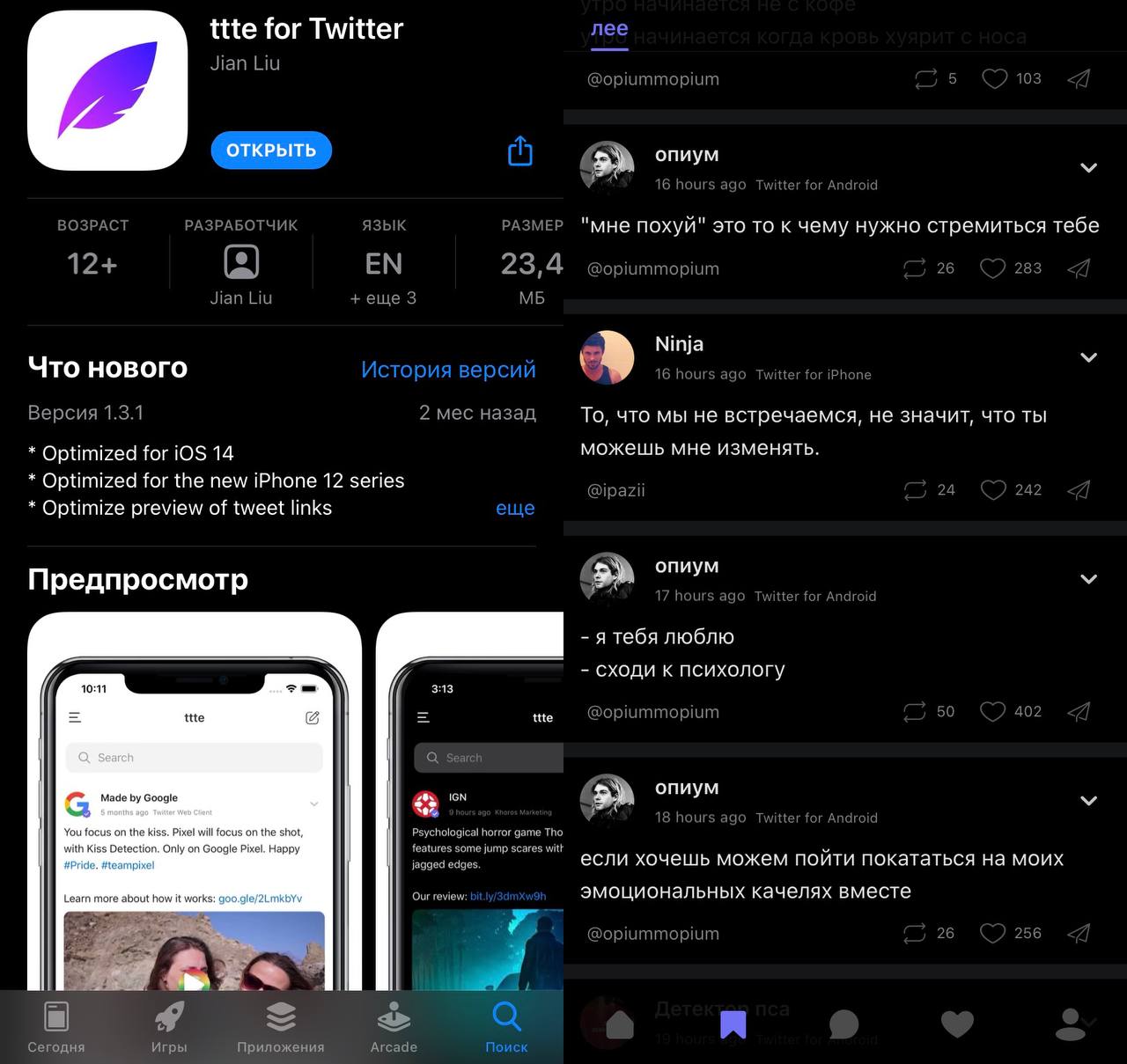 Альтернатива официальному твиттеру для тех кто там что-нибудь читает, вести твиттер я думаю там не очень удобно. Огромный плюс этого клиента в том, что в нем плотностью вырезана реклама.