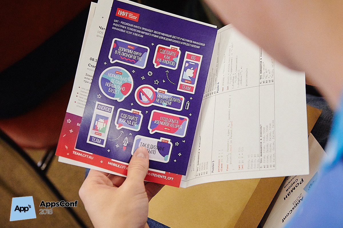 Обязательно возьмите сертификат участника и свой набор визиток. Иначе, как вы докажите коллегам, что были на конференции. Разве что запостите что-нибудь с хэштегом #AppsConf2018...