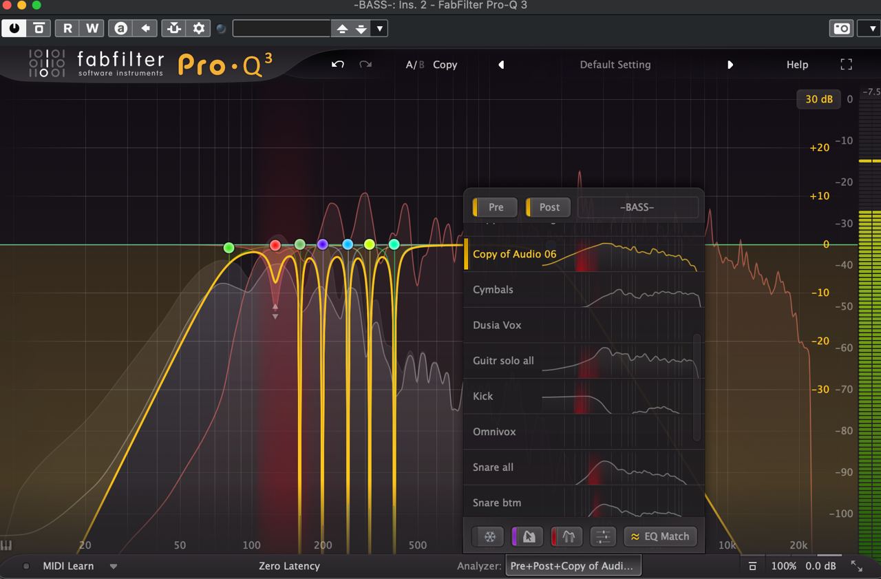 Чуть менее логичный — немного прибрать Бас и Снейр с помощью динамического эквалайзера (делается здесь же). И заодно вырезать эти частоты у гитар c помощью Mid/Side эквализации.