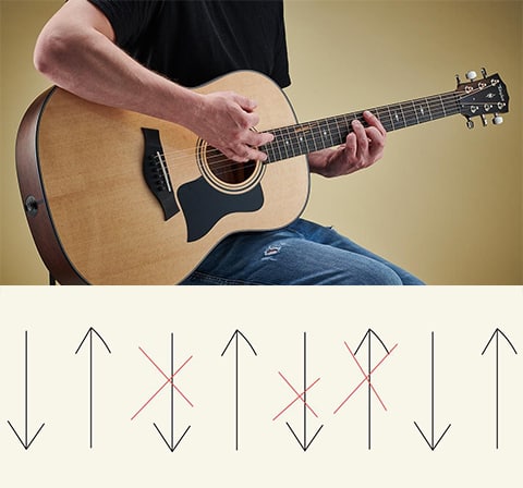 А если ты можешь сделать удары "вверх/вниз" по струнам, то почему бы одному из этих ударов не быть ударом "по воздуху"? И таким образом каждый раз получать новый ритм, просто убирая в нужный момент руку от струн.