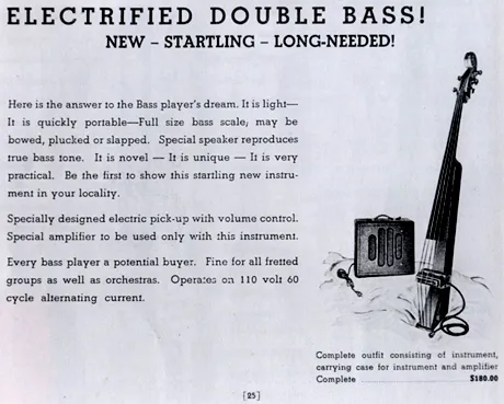 "Vega Electric Bass Viol", "Electrified Double Bass by Regal" и " Rickenbacker Electro Bass-Viol", как предки современного электро-контрабаса, со своими собственными звукоснимателями и комплектным усилителем.
