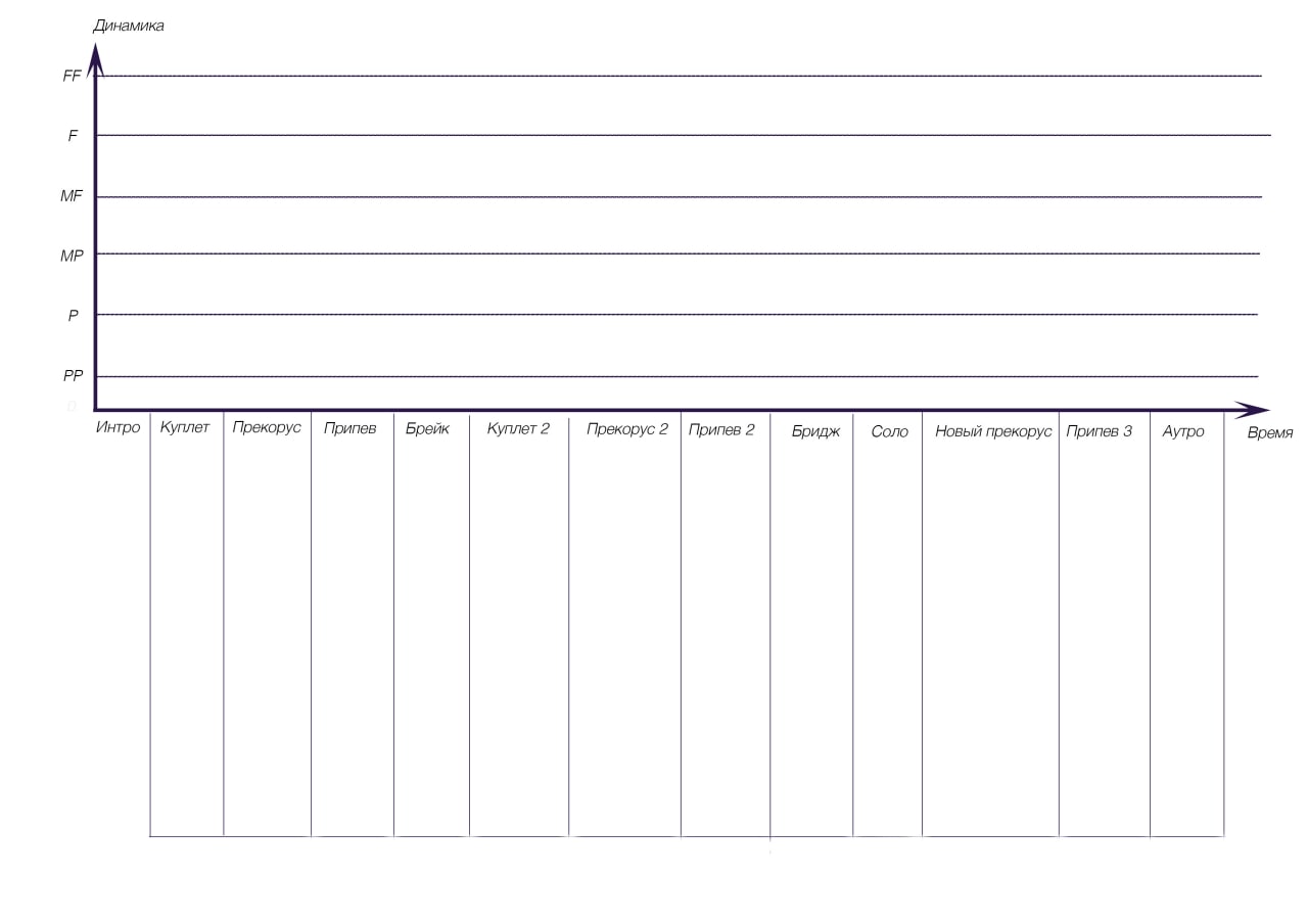 Ну вот, теперь чуть яснее стало, что делать с песней. А чтобы стало еще понятней я опять оставлю мою любимую пикчу, которую я специально сделал для аранжировок. Здесь можно прописать себе динамику, форму и даже состав инструментов с аккордами. Невероятно удобная вещь. Кайфуйте✌️