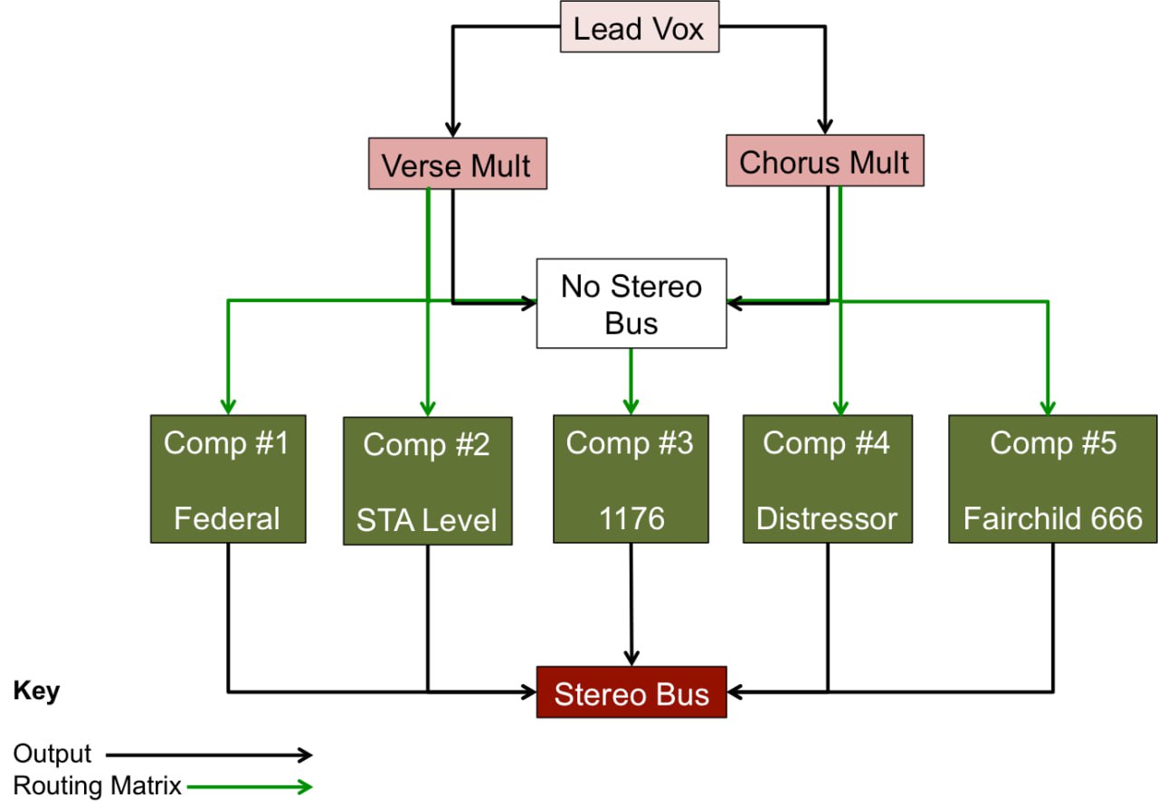 Итак у нас имеется голос (почищенный, без лишних резонансов), от которого мы делаем посыл в 5 разных компрессоров (5 FX Track). Посылы конечно "post-fader". После чего выход основной дорожки вокала ставим "No Bus". То есть вокал как бы есть, но звучит он только через наши посылы в компрессоры.