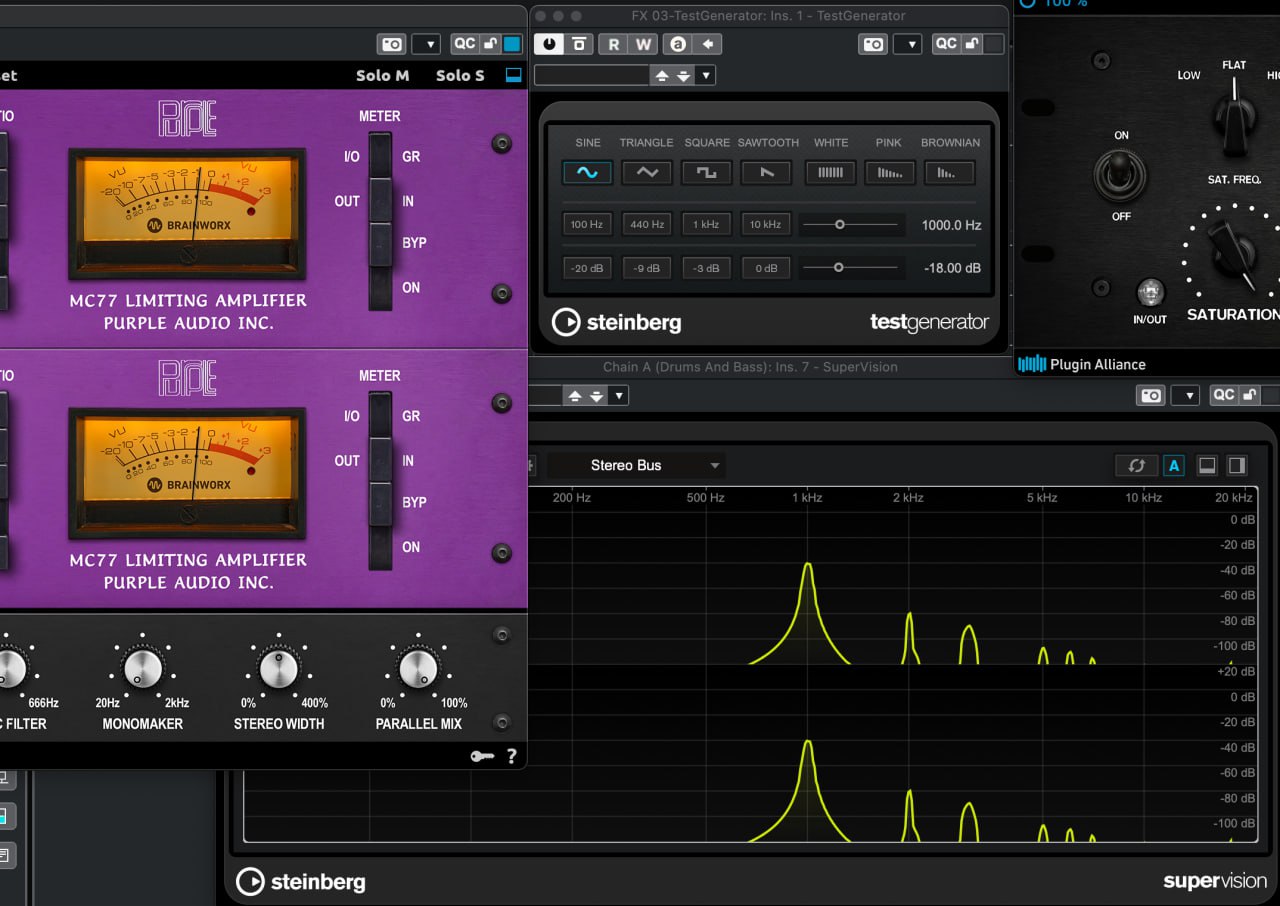 1) Выход Тон Генератора отправляем в группу "А" (Барабаны и Бас). И смотрим по "VU" измерителю (расположенному в конце цепи, что логично) что сигнал наш попадает в ноль (оно же -18 dbFS). И включаем компрессор (в моем случае аналог 1176 — "MC77" от "Plugin Alliance"). И видим, что громкость изменилась (вместо нуля стала 2). Значит компрессор подогревает сигнал и на стандартной уже настройке делает его громче. Но нам это сейчас не так важно.