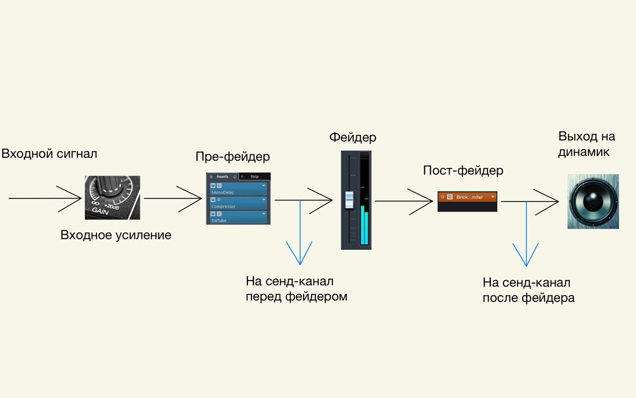 4) А потом идет пост-фейд обработка, на которую уже никак не влияет регулировка фейдера. А значит ты можешь убирать основной сигнал, оставляя только обработку (на сенд канале работает прекрасно). Например так легко убрать чистый сигнал, оставив только реверберацию. Или поставить лимитер, который будет работать последним оплотом контроля.