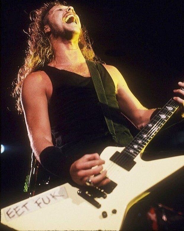 7) James Hetfield — “EET FUK” ESP Explorer (Metallica). Так же гитара стандартной модели, кроме одного "но".