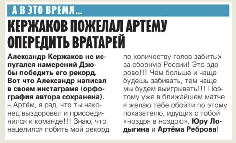 Хорошее дело затеяли в безфутболье - пересмотр и перепись гола Александра Кержакова, который в этом году уступил рекорд по количеству забитых голов за сборную России Артему Дзюбе - 31 против 30. Очевидно, гол в ворота сборной Германии в 2005-м официально перепишут с Аршавина на Кержакова и у него тоже будет 31 гол, как и у Дзюбы после гола Гренаде.