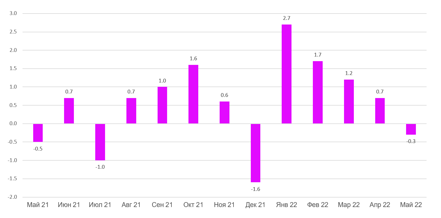 Если смотреть на динамику год к году - розничные продажи выросли на 8.1% в мае против инфляции в 8.6%.