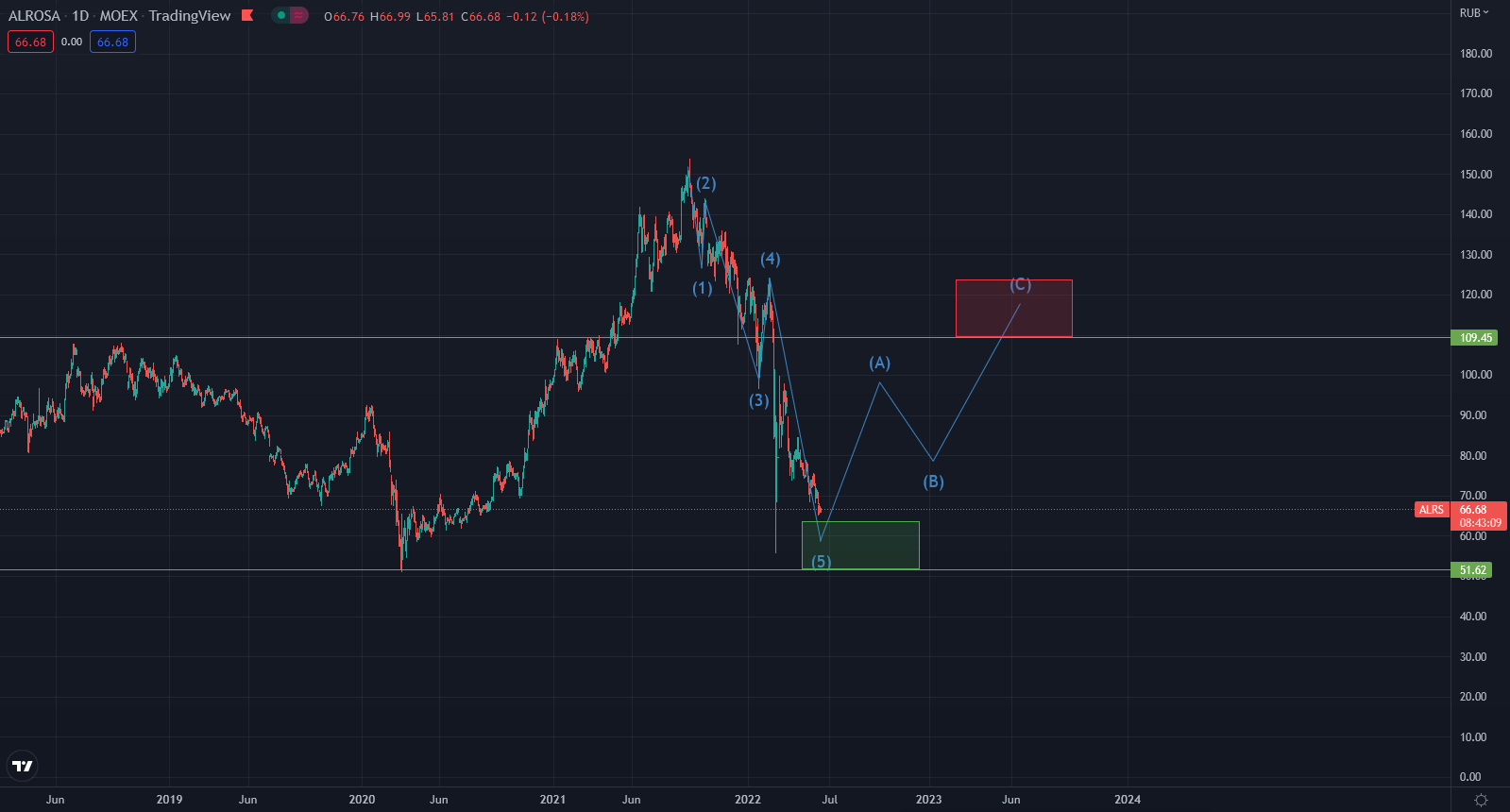 Если мы закладываем дисконт к цене реализации компании в 30% (что весьма существенно) при нынешнем курсе рубля - 58-59 рублей за акцию выглядит справедливо, что подразумевает падение на, примерно, 13%. Однако, для долгосрочных инвесторов текущие уровни уже могут выглядеть интересными для частичных покупок - при реализации хотя бы части позитивных факторов перечисленных выше, потенциал роста по бумаге в рублях может составить 50%+ на горизонте 1-1.5 лет.