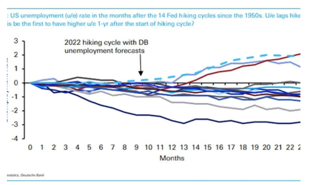 Сейчас статистика по занятости сильная, что развязывает руки ФРС дальше ужесточать монетарную политику. Если смотреть на историю (на графике ниже), то ставка начинает влиять на занятость примерно через 12-18 месяцев с начала цикла ужесточения ставок.