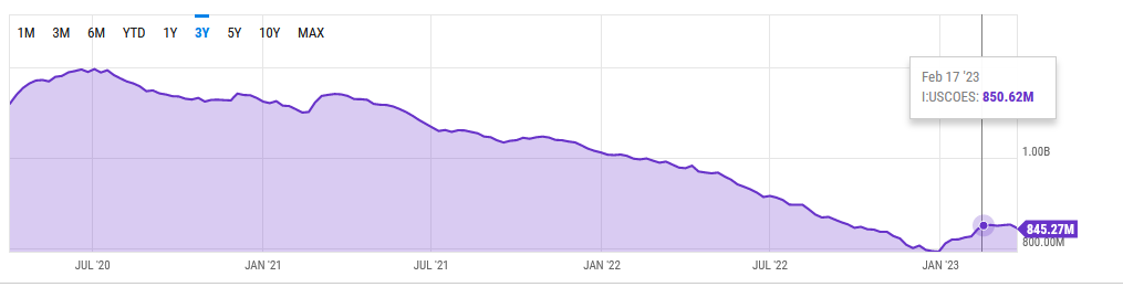 Достаточно взглянуть на динамику запасов в США (на графике ниже), чтобы понять, что в отсутствии жесткой мировой рецессии прогноз Goldman про $95/бочку Brent к концу года звучит уже не настолько оптимистично, как до этого.