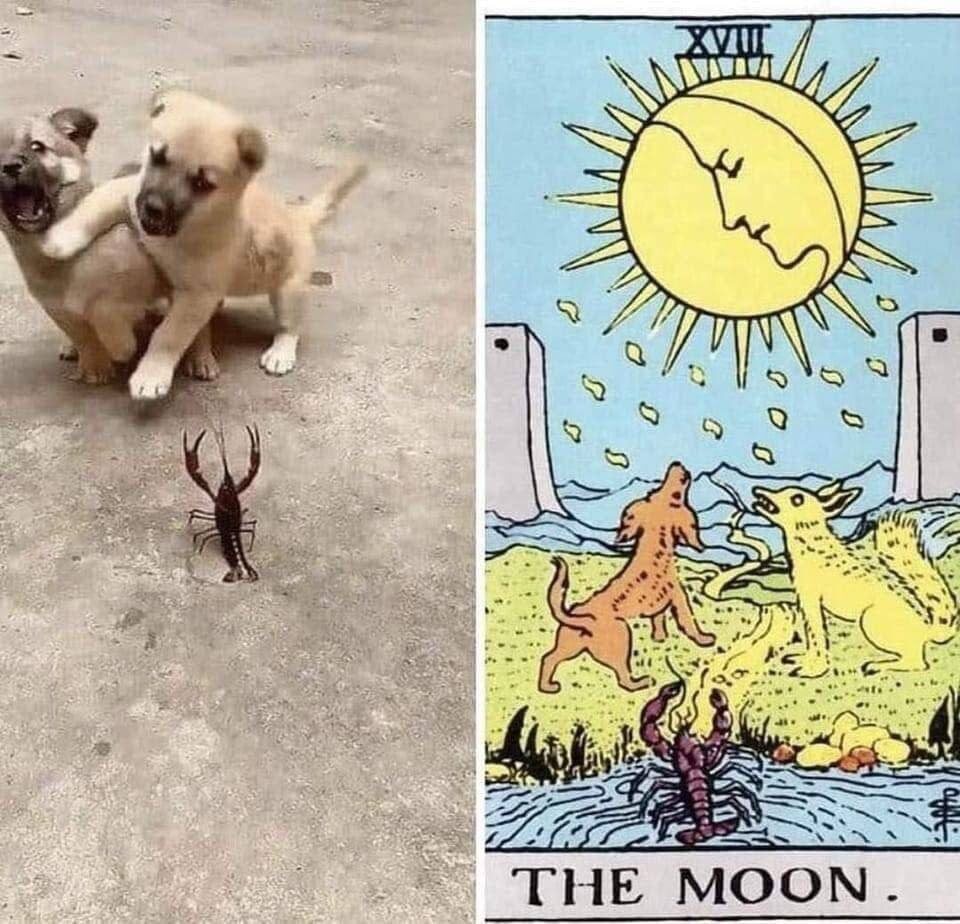 В общем, нагнетание напряжения только усиливается, стены внезапно сдвигаются, и смысл этого в том, чтобы осознать, в какой тесной клетке ты живешь, и увидеть эти стены иллюзорными, придуманными, рассеяв их, не дать им сдвинуться. Не во всем сразу, но именно в той области, в ситуации, которая описана арканом Луны, или именно в тот период, в который этот аркан действует. Луна указывает, где мы можем преодолеть свою обусловленность низшей и животной природой (не зря же тут всякие собаки, волки, раки изображены) и увидеть иллюзорным весь тот бред, который нами управляет.