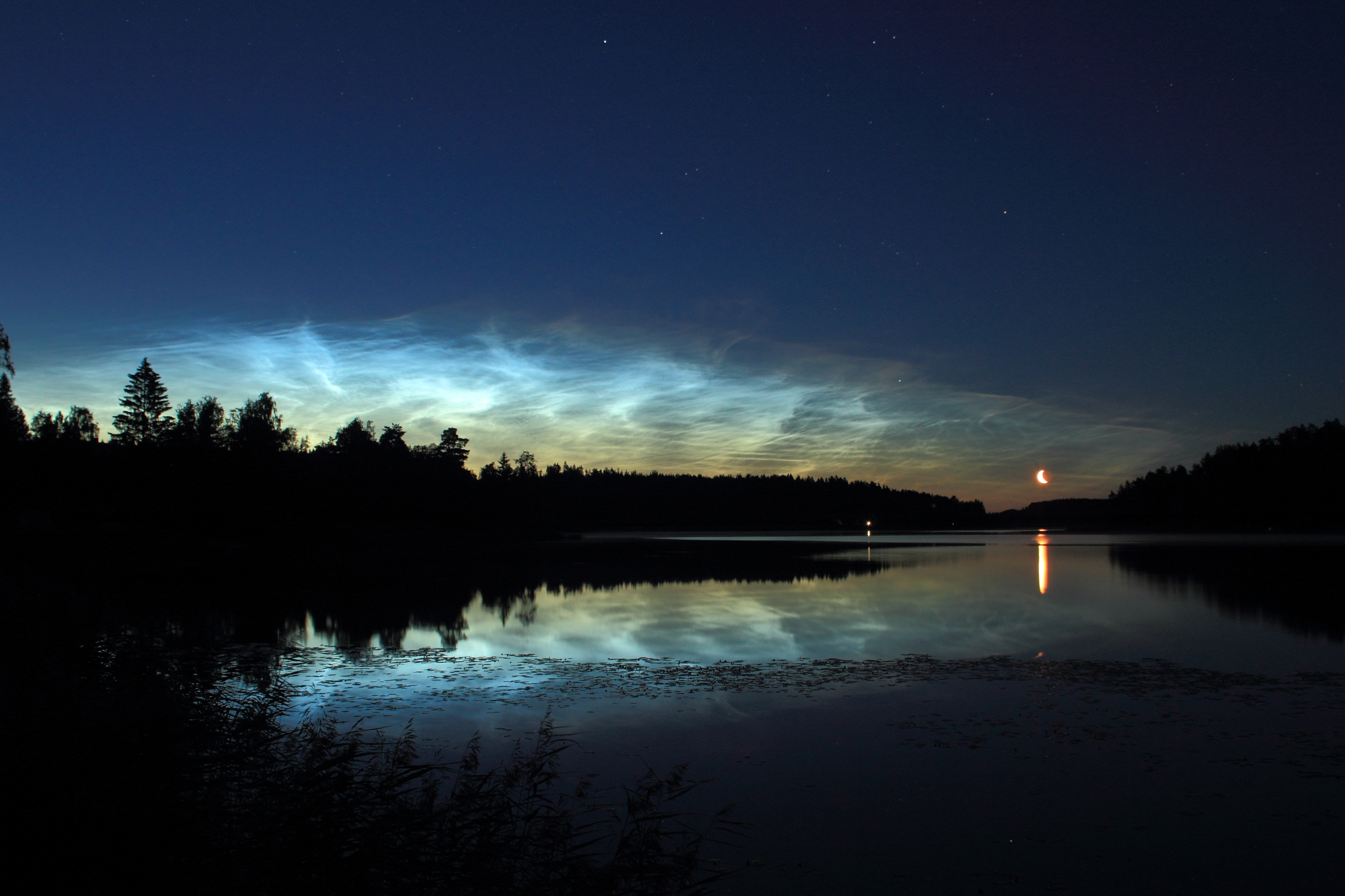 Финляндия, община Сауво (60,3° с. ш.). 3/4 августа 2021 года. Автор снимка: Микко Пеусса; Параметры: Canon 550D + 21mm, f/5.6, ISO-400, 15sec; Источник: spaceweathergallery.com