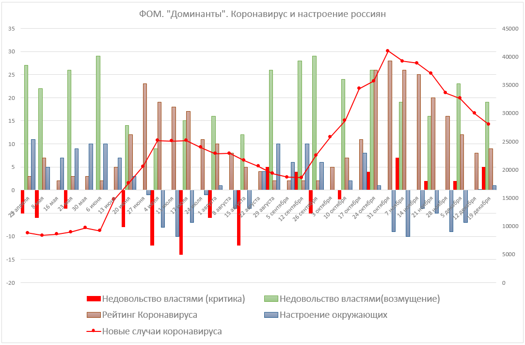 «Доминанты» ФОМ фиксируют стабильность «рейтинга коронавируса» — суммарный интерес к темам «Пандемия коронавируса» (5% интереса, без изменений) и «Антиковидные меры, обязательная вакцинация, введение QR-кода» (4%, плюс один пункт). То есть, принятие Госдумой в первом чтении законопроекта о введении QR-кодов, по сути, не вызвало значительного интереса к этой теме. Немного снизился индекс «возмущение властями», но не критично, «критики действий власти» и вовсе стало меньше (индекс вырос, по сравнению с предыдущими замерами). Индекс «настроения общества» впервые с начала ноября перешел в позитивную зону.