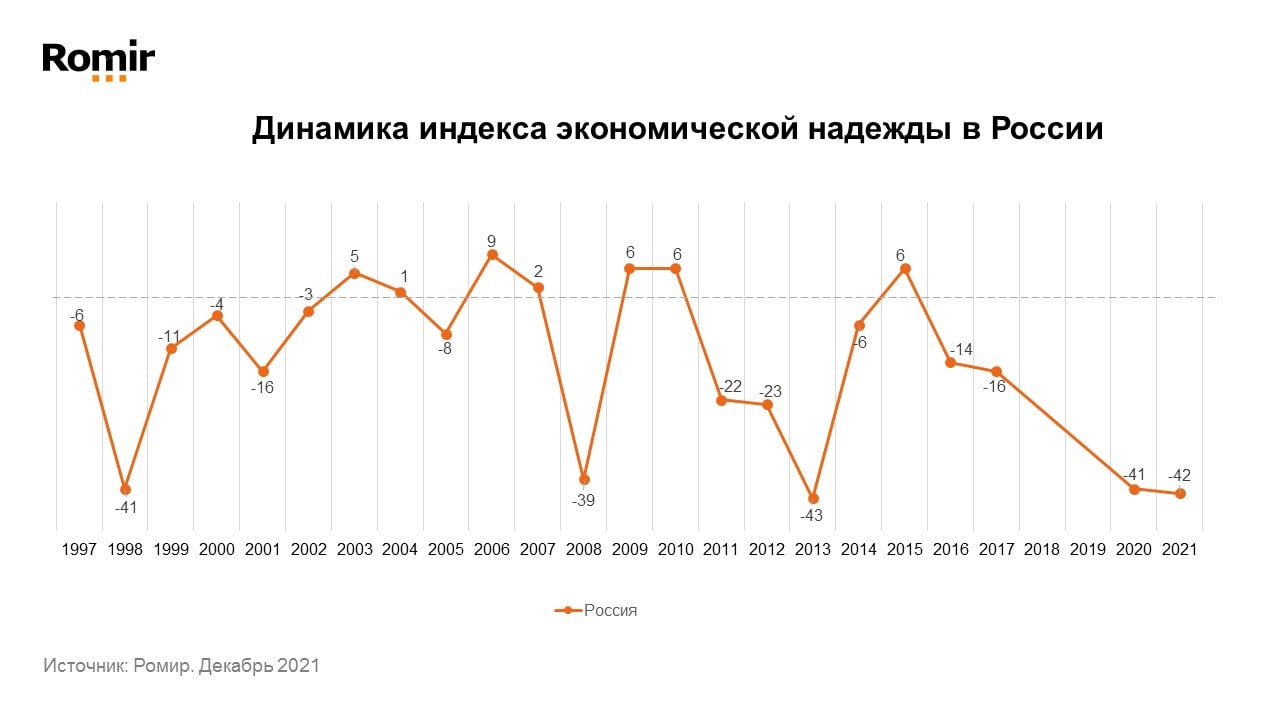 Динамика индекса экономической надежды в России (разница между ожидающими процветания и трудностей), демонстрирует сильный негатив и составляет 42 п.п., как и в «первый ковидный 2020 год». Аналогичный показатель наблюдался в России 1998 и 2013 годах.