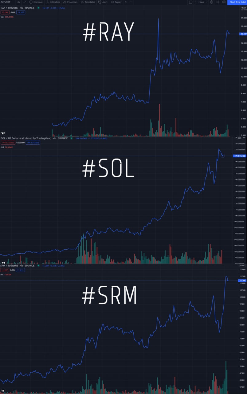 1) #RAY-#SRM - 110% APR, цены движутся вместе, оба токена сильно зависят от экосистемы Solana и цены на монету #SOL (смотреть на прикрепленные графики). Могут быть просадки и колебания цены, но на длинной дистанции все потери будут нивелированы. За стейк зарабатываем #RAY