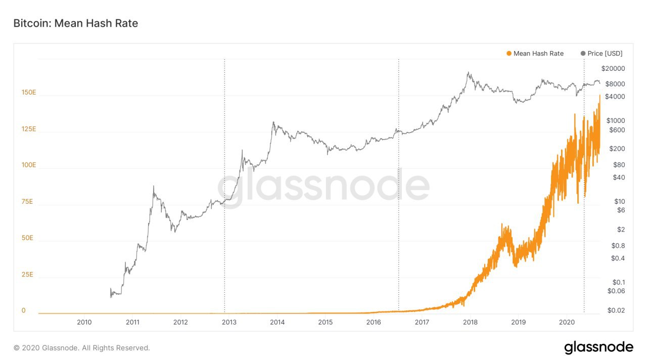 Согласно Glassnode, сегодня величина хешрейта биткоина впервые поднялось до 156 экзахешей в секунду (EH/s). Предыдущий рекорд был установлен 11 мая в день третьего халвинга биткоина на отметке 152 EH/s. Впоследствии показатель опускался до 90 EH/s. Рост хешрейта происходит несмотря на негативную динамику рынка в последние дни. В очередной раз безуспешно протестировав сопротивление $12 000, первая криптовалюта откатилась к $10 000, где удерживается в момент публикации. В понедельник состоялся очередной перерасчет сложности майнинга. По данным BTC.com, в результате значение снизилось на 1,21% до 17,35 T. Перед этим сложность находилась на рекордном максимуме в 17,56 T. Glassnode также сообщает, что сегодня среднечасовой объем транзакций в блокчейне биткоина поднялся до нового годового максимума в 130 110 BTC. Предыдущий рекорд был зафиксирован 1 сентября.