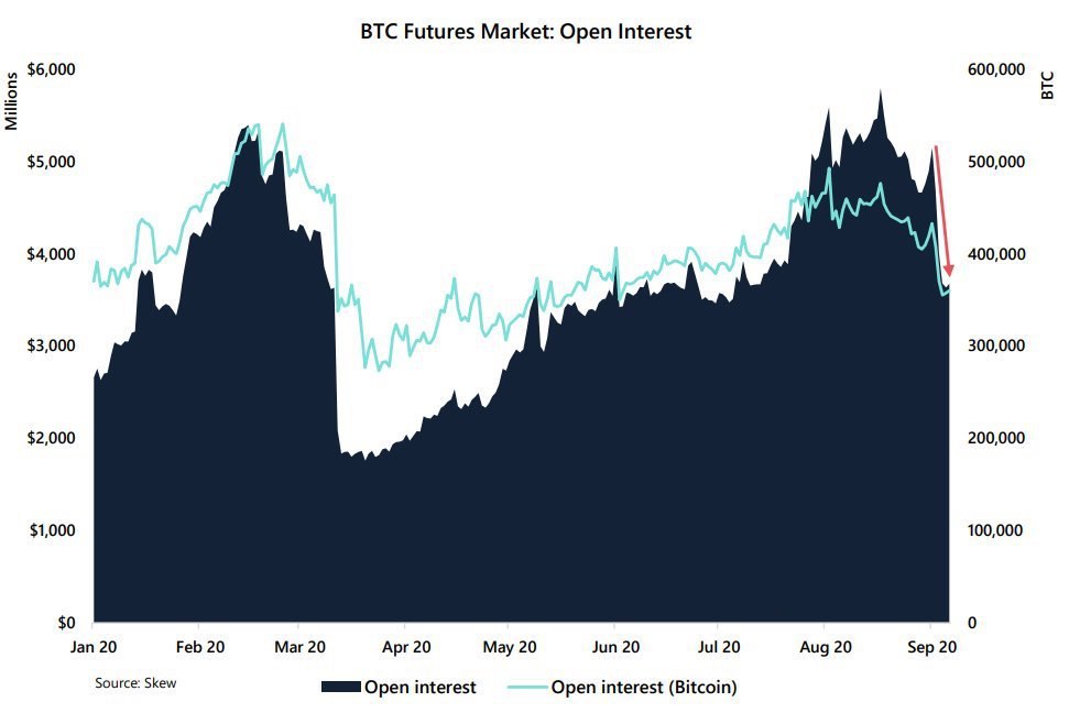 С начала сентября цена первой криптовалюты просела примерно на 20%. За это время открытый интерес (OI) на рынке биткоин-фьючерсов снизился на 28%, поделились наблюдениями аналитики Arcane Research. 1 сентября совокупный OI по фьючерсам составлял $5,1 млрд. В течение недели показатель снизился до $3,7 млрд. Наибольший OI на бирже OKEx - $0,83 млрд, а по суточному объему торгов лидирует Binance Futures - $3,43 млрд. 17 августа открытый интерес на Чикагской товарной бирже (CME) достиг пика на отметке $948 млн (тогда же предупреждал о будущем падении). Текущий OI на этой регулируемой платформе составляет $435 - просадка по отношению к максимуму составила 54%. Однако исследователи уверены, что нет причин для паники - ценовое ралли невозможно без периодических коррекций.
