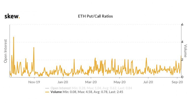 Активность на рынке Ethereum-опционов свидетельствует о том, что трейдеры все чащи берут опционы пут или медвежьи ставки. Соотношение пут-колл по таким опционам в среду достигло 2,45, высочайшего уровня с 31 октября 2019 года. Другими словами, на каждый опцион колл сейчас приходится свыше двух опционов пут. Это мощный сигнал в пользу краткосрочного падения! «Вероятно, так трейдеры хотят хеджироваться против активности в DeFi-пространстве, которая стала первичным драйвером роста цены эфира», – заявил в разговоре с CoinDesk опционный трейдер и основатель биржи Alpha5 Вишал Шах. Тем не менее, медвежьи ожидания участников рынка распространяются именно на краткосрочные перспективы, тогда как опционы колл с трех- и шестимесячным сроком экспирации по-прежнему стоят дороже, чем пут.