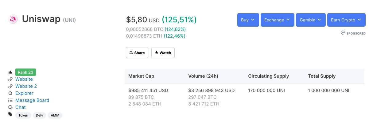 Токен Uniswap вошел в топ-50 активов крипторынка, обновив максимум выше $5.