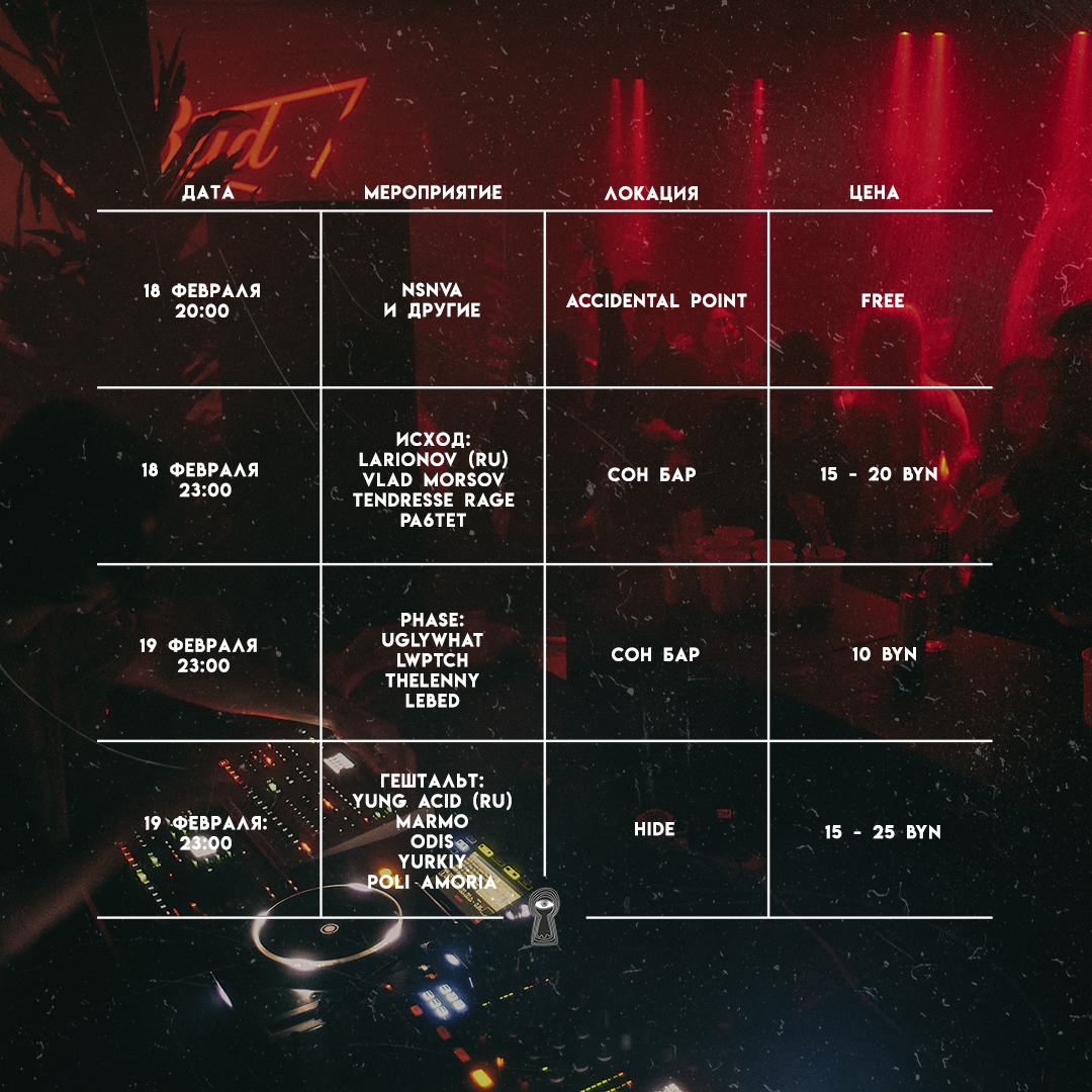 👉🏼 Суббота. HIDE (@minskhide). Новый Гештальт (@gestalt.promo), с именитым хедлайнером в лице дуэта YUNG ACID (@_yungacid_), а также локальным саппортом от резидентов проекта.
