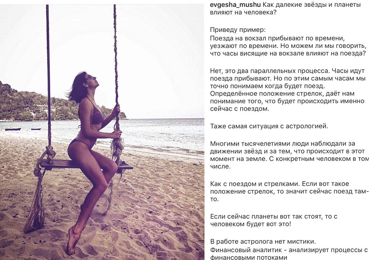 Астролог-психолог и звезда «Нового утра» Женя Головина очень долго рассказывает у себя в Инста, что астролог - это такой же специалист, как юрист и финансовый аналитик. Никакой мистики, только анализ и прогнозирование. «Если звёзды вот так стоят, то с человеком будет вот это» - поясняет девушка.