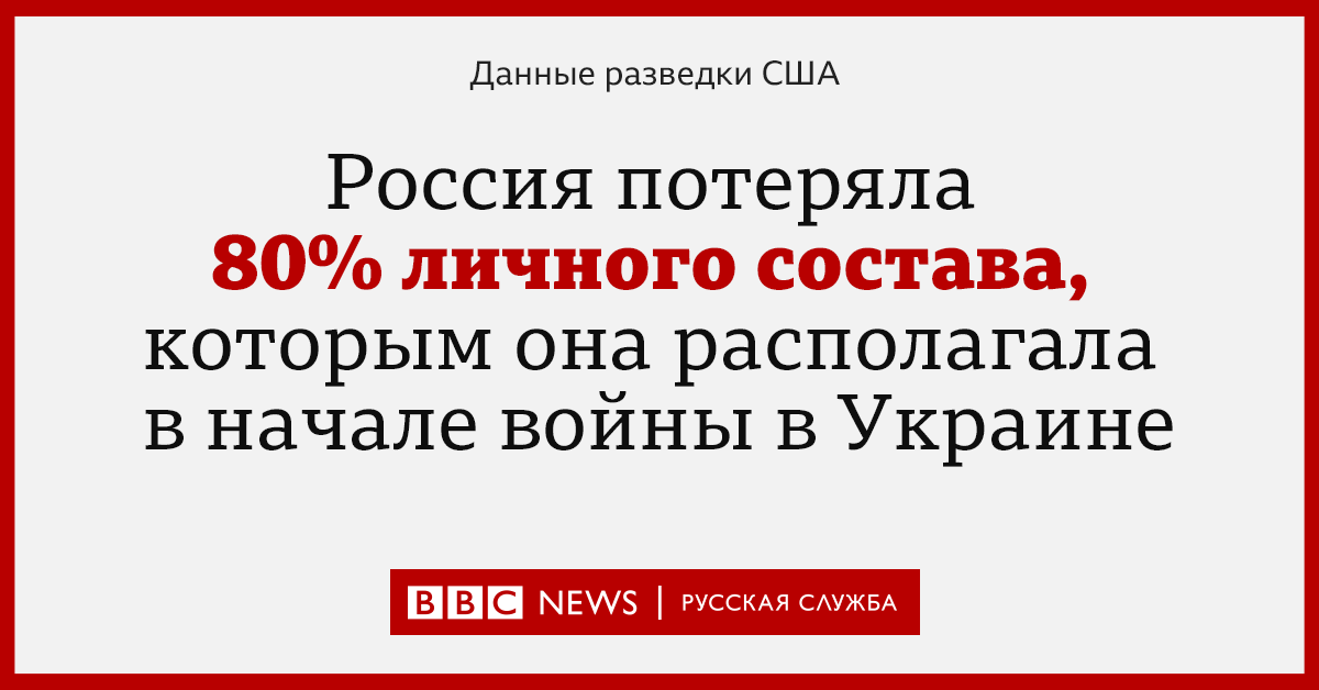 По оценкам разведки США, война на Украине обошлась России в 315 000 убитых и раненых военнослужащих, или почти 80% личного состава, которым она располагала на момент начала конфликта, сообщил во вторник источник агентства Reuters, знакомый с данными американской разведки.