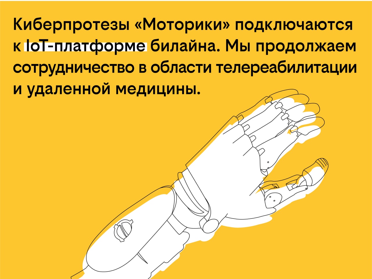 Адаптироваться к бионическим протезам (работают за счет электрического потенциала мышц) нелегко: люди ходят к реабилитологам на протяжении долгого времени, чтобы быстрее научиться пользоваться новым гаджетом. «Умные» бионические протезы оснащены IOT-чипами билайна. Это позволяет удаленно контролировать процесс реабилитации и развивать направление в медицине – удаленный мониторинг «умных» устройств, которые встроены в тело человека. Для передачи пользовательских активностей в протезах «Моторики» были установлены модули eSIM и Bluetooth, также осуществляется поддержка GSM и LTE. Пациенту не нужно ездить в реабилитационный центр — вся информация с протеза попадет в его личный кабинет врача в «облаке». Врач через личный кабинет видит показания пациента и может при необходимости корректировать процесс обучения, что позволяет ему быть непрерывным, сокращает количество визитов в медицинское учреждение и время на привыкание.