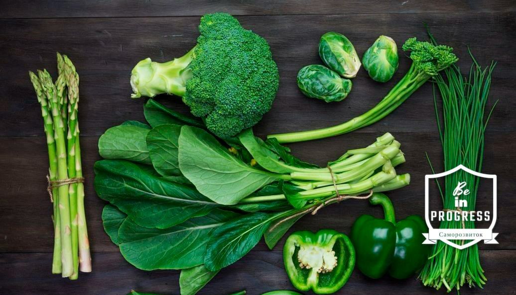 Ми щодня повинні включати до раціону різноманітні овочі, і серед них регулярно мають бути овочі зеленого кольору: листя салату, шпинат, капусту броколі, цибуля порей, листя буряка, кріп, петрушка, кінза, рукола та інші.