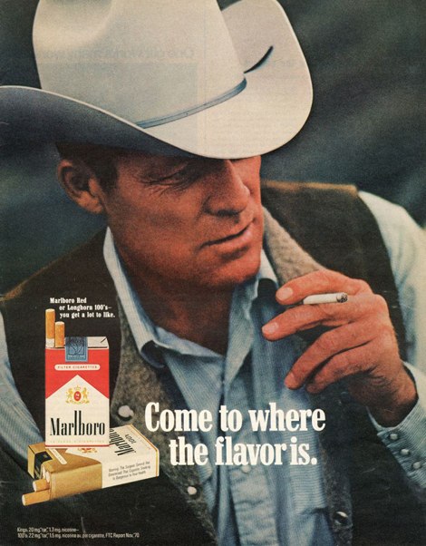 В начале 1970-х годов в Америке запрещают рекламировать табачную продукцию по телевидению. Уже популярный ковбой «переселяется» на страницы журналов и периодически начинает появляться в кино (продакт-плейсмент – скрытая реклама брендов в фильмах и телепередачах). Никакие запреты не помешали сигаретам Marlboro стать самым продаваемым табачным продуктов в мире на конец 1970-х.