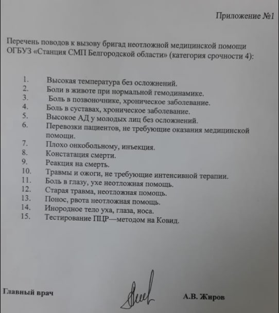 Вместе с медиком к больному отправляется только водитель. Это следует из документа, который оказался в распоряжении «Белгород №1».