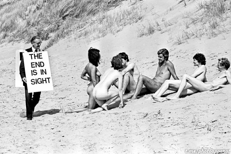 في الصورة : ناصح متطوع على شاطئ للعراة ، يحمل لوحة كتب عليها : النهاية تلوح في الافق.