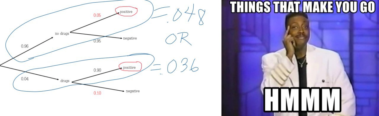 Потенциальный сотрудник может получить положительный результат, когда они принимают наркотики ИЛИ когда они не принимают наркотики. Используя правило вероятности «ИЛИ» означает, что вы должны что-то приплюсовать. Так как можно получить положительный результат двумя разными способами, просто сложите их вместе после того, как рассчитаете вероятности отдельно: P (положительный) = (0,960,05) + (0,040,90) = 0.048 + 0.036 = 0.084.