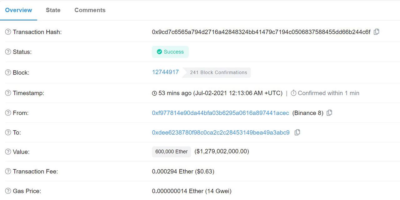 ⚡️Вчера с Binance один из «китов» вывел 600 тыс. ETH, стоимостью $1.28 млрд(!) по текущему курсу. Интересен не столько сам перевод, сколько комиссия, которая составила, внимание, ~$0.63!