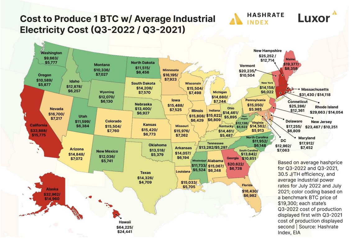 🇺🇸Расходы на добычу 1 биткоина в III-м квартале 2022 года по сравнению с тем же периодом год назад