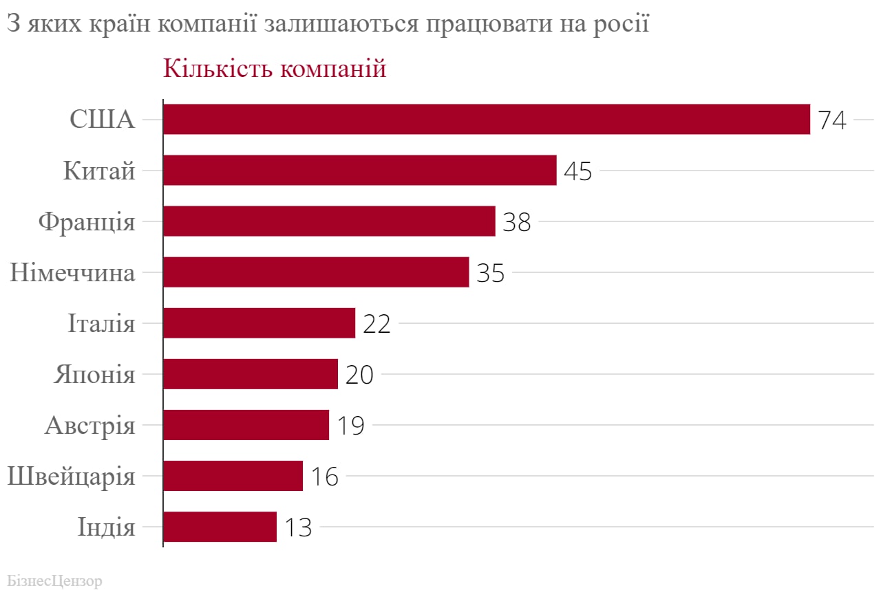 Найбільша кількість компаній, які залишаються на росії, із США - на 30 травня на ринку країни-агресора продовжує працювати 74 компанії зі Штатів.