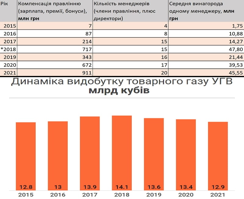 Провели невеличкий ресерч: підняли дані з фінансової звітності Нафтогазу про «компенсацію ключовому персоналу» та наклали це на дані з видобутку товарного газу (газ для споживання без врахування виробничих втрат).