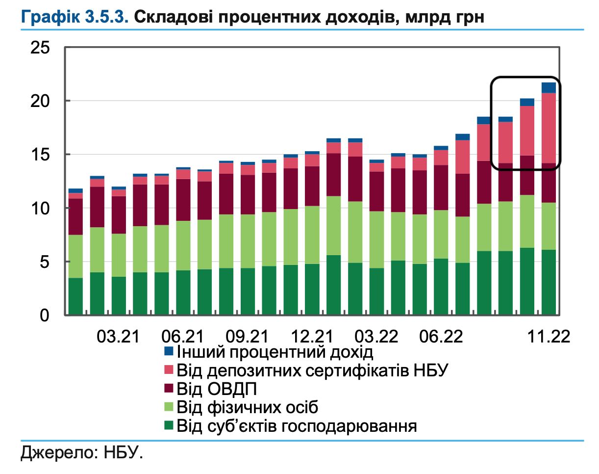Відсотки за педсертифікатами НБУ виплачує за рахунок емісії гривні. За 5 місяців, з моменту збільшення облікової ставки до 25% та підняття дохідності за депсертифікатами до 23%, НБУ сукупно виплатив банкам відсотків на 20,1 млрд грн.
