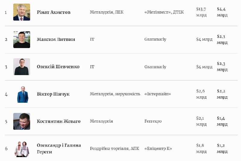 За оцінками Forbes, традиційно список найбагатших українців очолив Рінат Ахметов ("Метінвест" та ДТЕК) зі статками $4,4 млрд. Він втратив за цей рік більше, ніж інші. Його статки скоротилися на $9,3 млрд.
