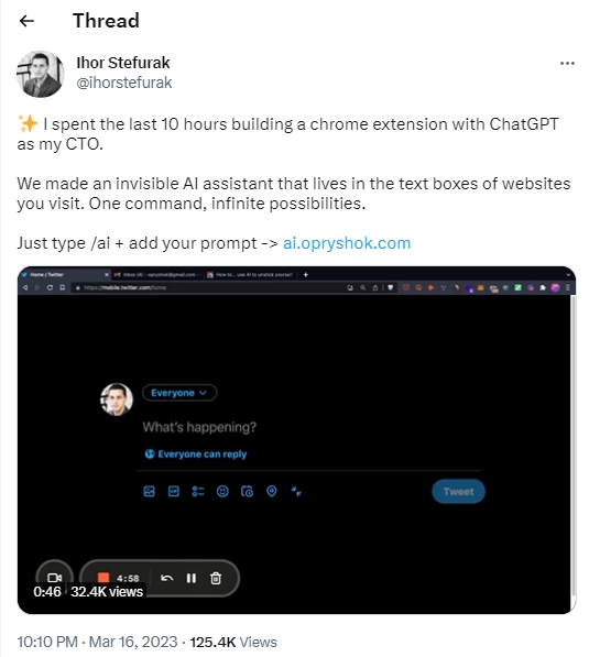 Що вони розробили? Це розширення для Chrome, яке дозволяє взаємодіяти з ChatGPT з будь-якого текстового вікна на будь-якому сайті за допомогою команди /ai. Ідея в тому, щоб дати користувачам доступ до чат-боту там, де потрібно, без необхідності відкривати окремий сайт ChatGPT та копіювати його відповіді.