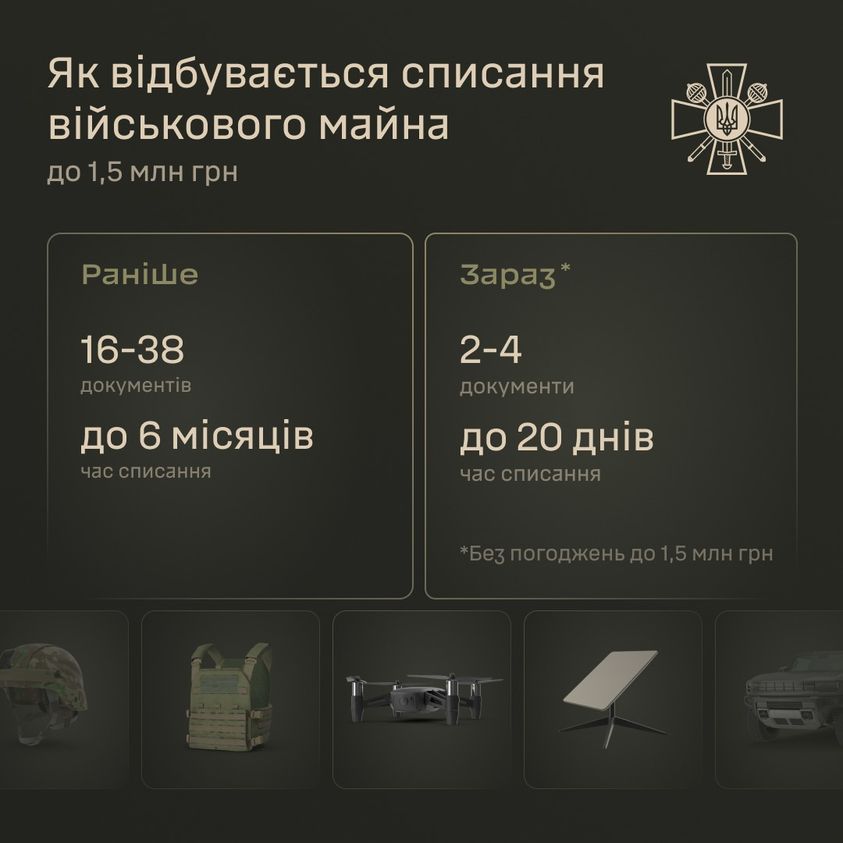 "Наприклад, раніше на списання дрона потрібно було зібрати до 40 документів. На це йшло від одного місяця до пів року. Ухвалені зміни скоротять процедуру до 20 днів. Техніку вартістю до 1,5 млн грн зможуть списувати командири окремих рот, батальйонів чи бригад", – розповів міністр.