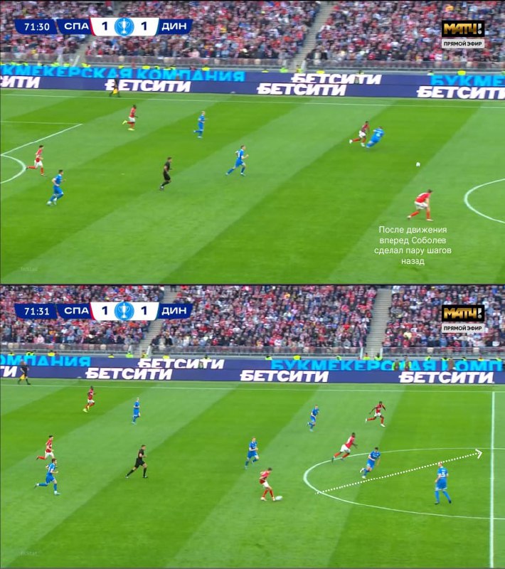 Теневой герой первого гола – Данил Пруцев. В перерыве показали классный повтор из-за ворот «Динамо», где было видно, что он правильно считал свободное пространство (был вариант с Промесом и пасом поперек, но Данил идеально заметил шаг в сторону от Михаила Игнатова).