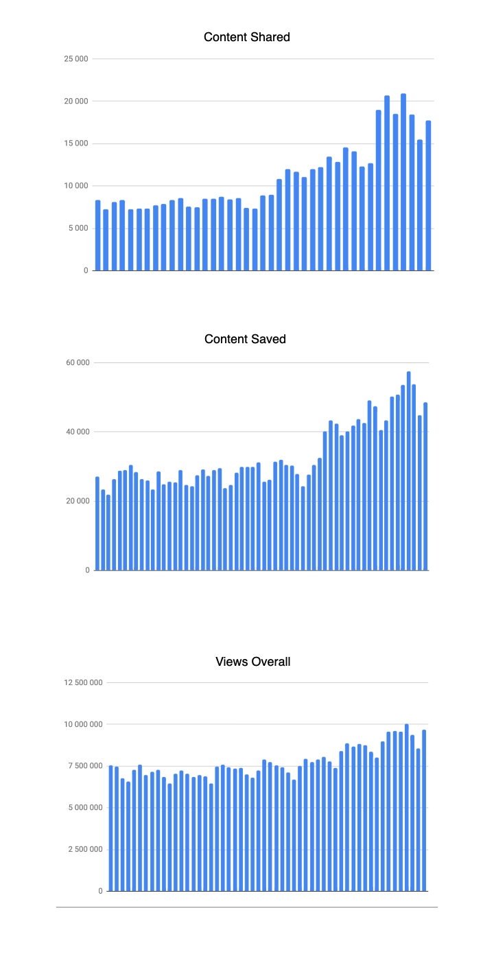 В июле на всю редакцию накатили простое изменение: минимум 30% контента в ленте должно быть от пользователей, а не редакторов. Через два дня метрики круто подросли: стали больше смотреть, шерить и лайкать. Например рост по шарам доходил до трехкратного.
