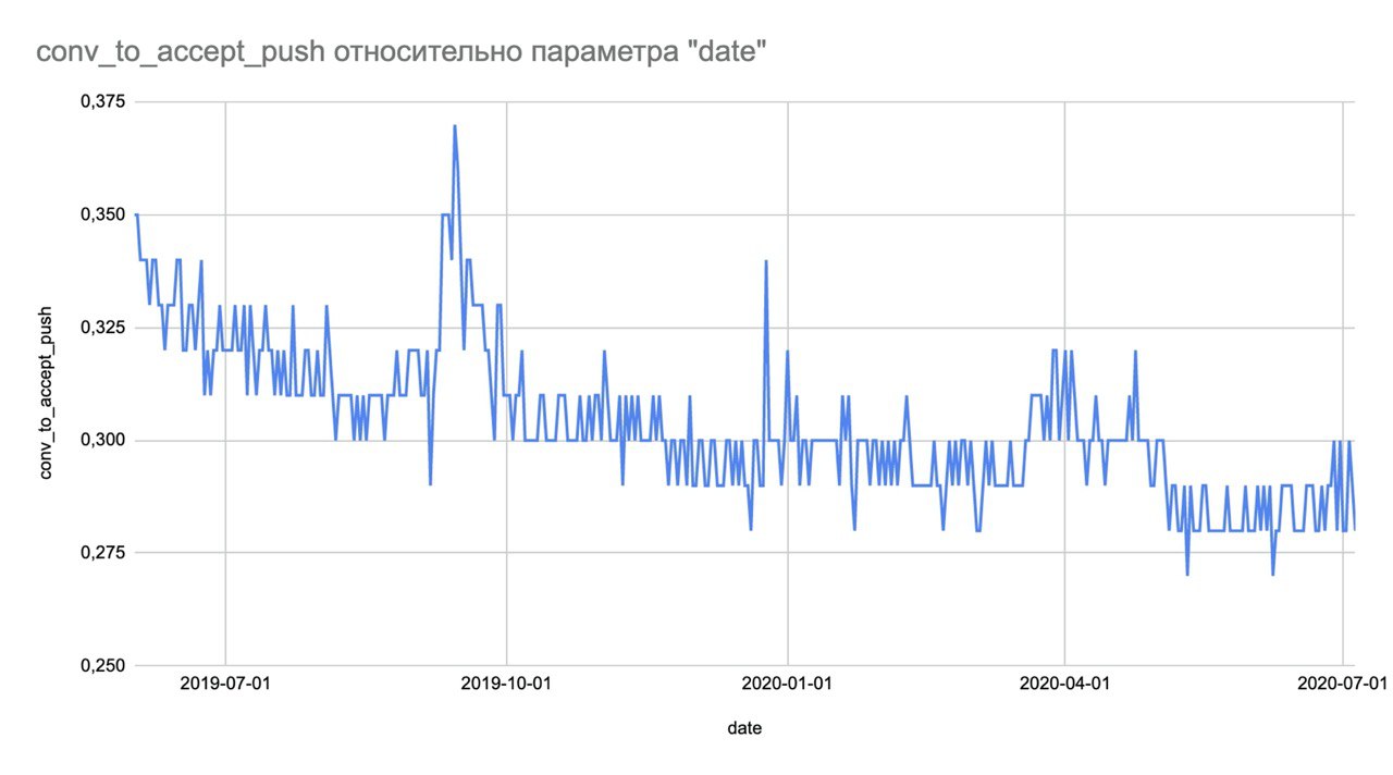 Это график одобряемости пуш уведомлений на новых iOS установках iFunny. Видно, что за год конверсия в одобрение деградировала на 20%, и теперь стала 28%. Когда-то, в 2018, она была около 50%.
