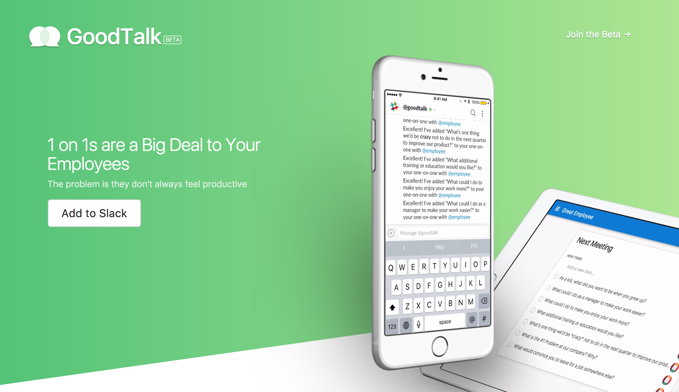 How do you have better meetings? Create an agenda. Share it before the meeting. Ask better questions. Take notes. Write down clear next steps. None of this is rocket science. The hard part is finding the time to actually do it. That’s why I want to show you a GoodTalk. GoodTalk is a a slack bot that helps make your 1 on 1s more productive, fun, and engaging 🎉