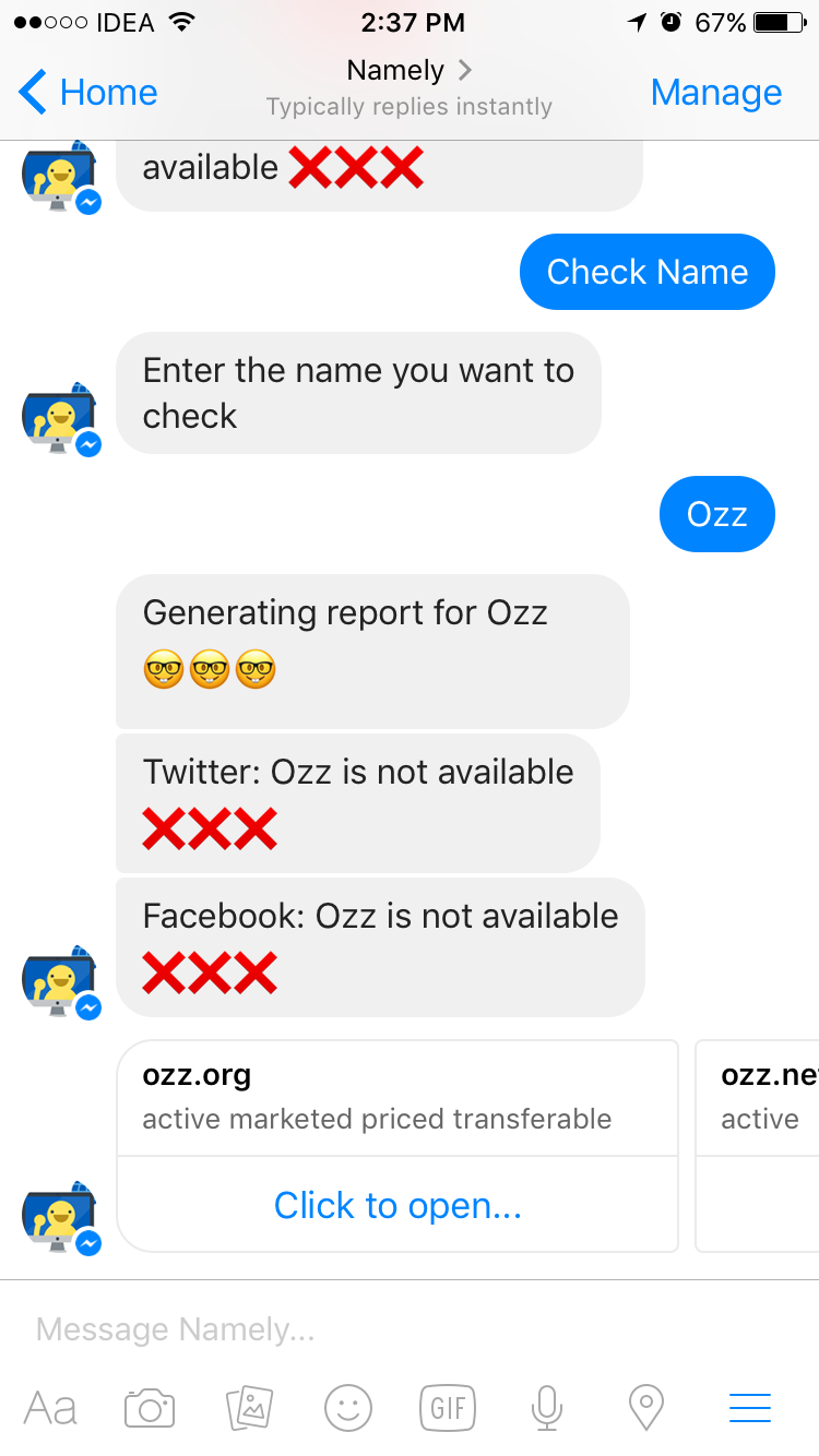 So, here is a bot called Namely. It’s a Facebook Messenger bot to help you decide your next projects’ name. You send it a name proposal and then it checks all the domains and social accounts availability for this name. Sounds like a huge time saver, right? 🙏🏻