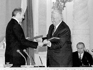 В дальнейшем дело было так. Весной 1996 года наши страны подписали «Договор об образовании Сообщества Беларуси и России». Было решено создать политически и экономически интегрированное образование. 29 апреля 1996 года в Санкт-Петербурге руководители парламентов двух стран подписали соглашение о Парламентском Собрании. За год были подготовлены документы, в том числе Устав Союзного государства. «Посыльные» Лукашенко метались по Москве и разносили «подарки» высоким лицам. Документ «без сучка и задоринки» прошел все согласования в министерствах и ведомствах. Получил визы российского МИДа и министерства по делам СНГ. СМИ хором «оттрубили», что 2 апреля 1997 Борис Ельцин и Александр Лукашенко планируют подписать новый Союзный договор. В перспективе которого – создание единого федеративного государства с единой таможней, валютой, гражданством, пограничным и военным союзом.